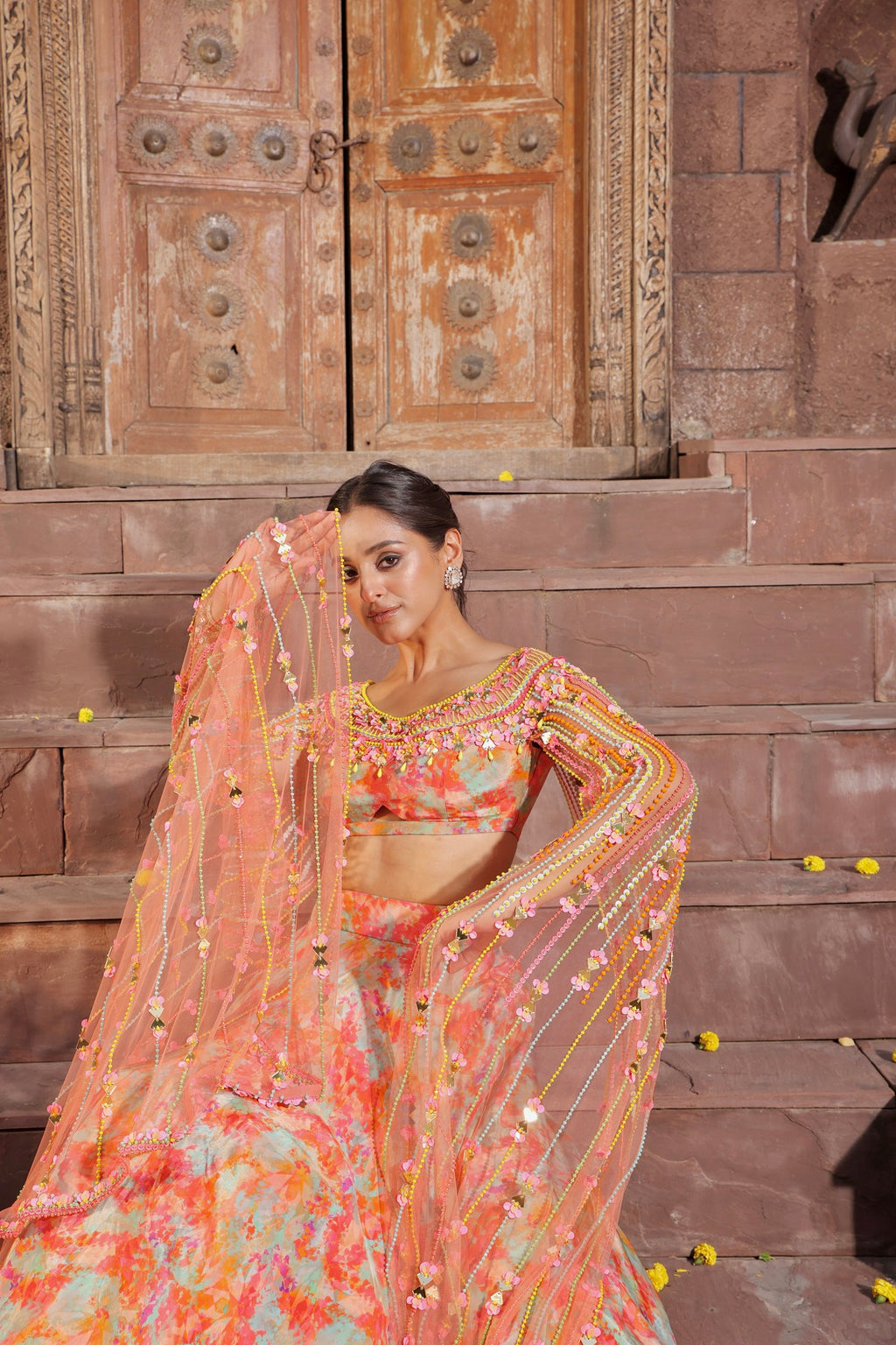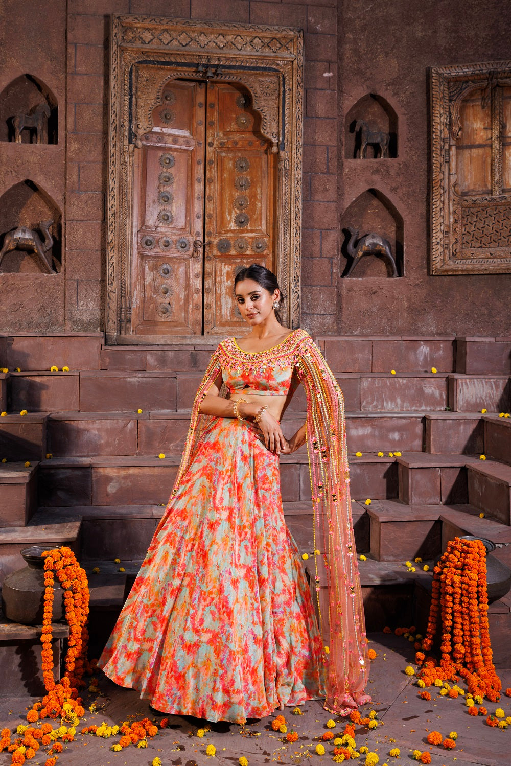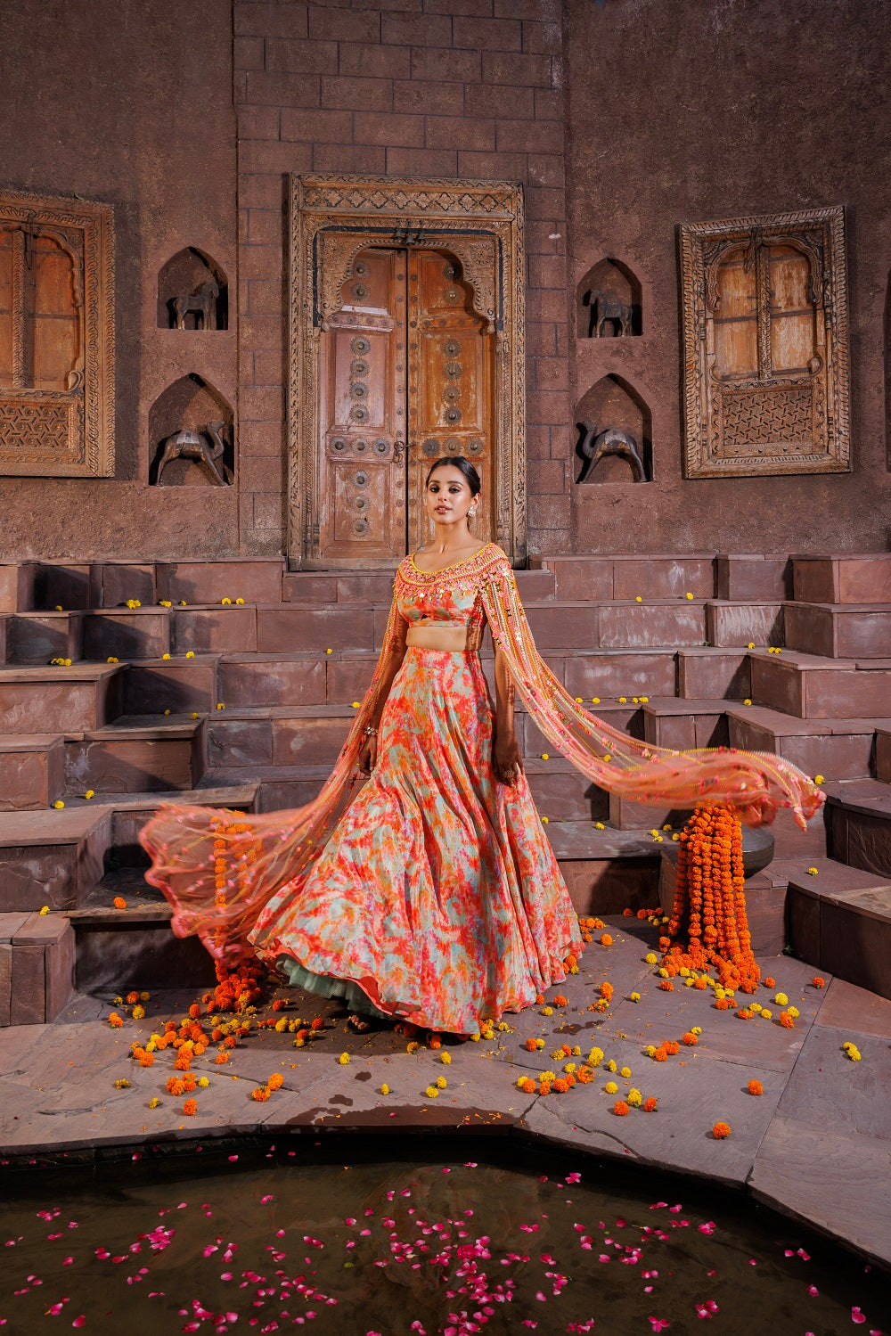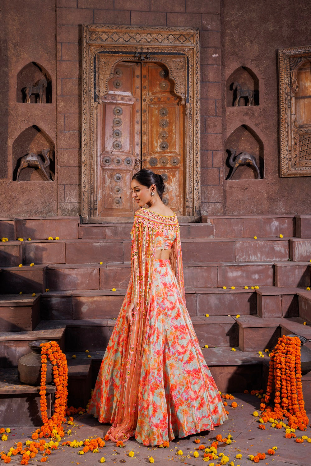 Indulge in opulence with our printed cape lehenga set in vibrant hues. Paired with an intricately hand embroidered blouse with attached tulle dupatta, making it perfect for your special occasion.