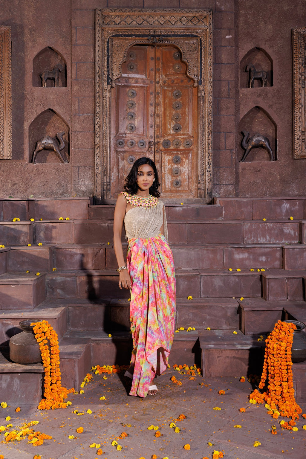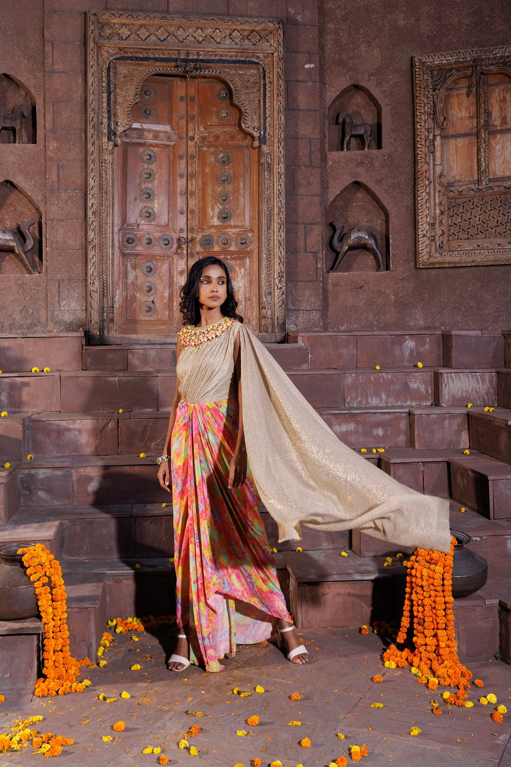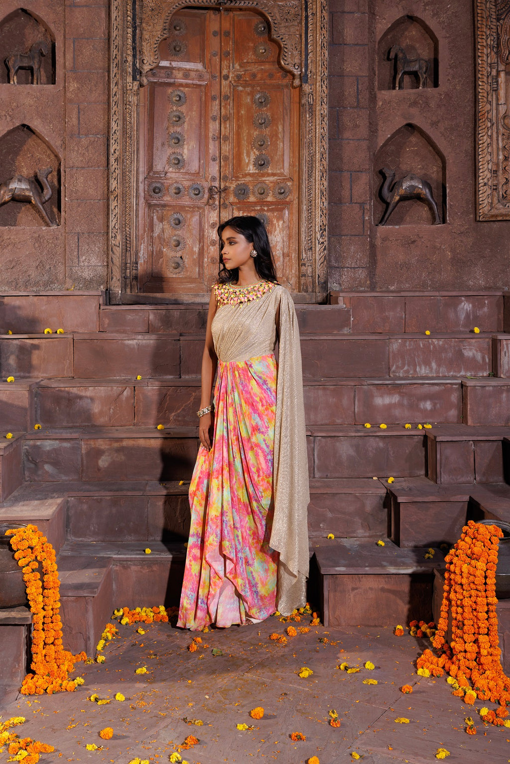 Experience opulence in our vibrant Printed Drape Saree, adorned with shimmer fabric. The one-sided yoke, paired with a separate hand-embroidered neck piece, exudes unparalleled sophistication and elegance.